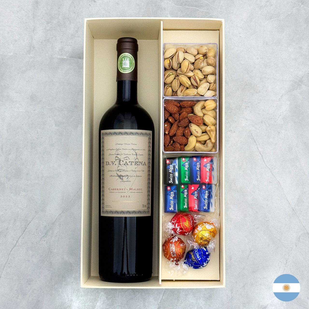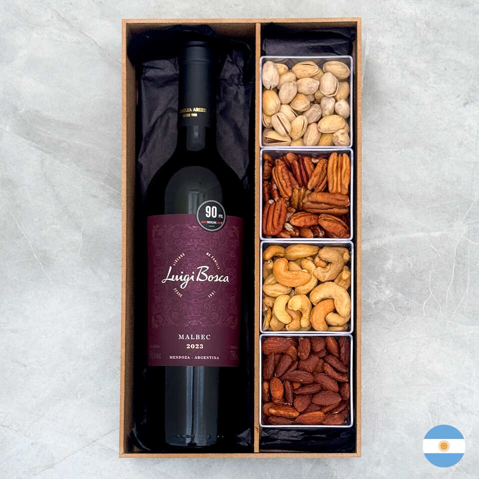 Produtos: - Pistache - Nozes Pecan - Castanha de caju - Amêndoas defumadas - Bombons de chocolate Polonês ao leite recheado com creme de pistache - Tabletes de chocolate Suíço Swiss Alps - Alfajor Havanna - Bombons Lindt Lindor sortidos - Caixa de papel personalizada rígida na cor creme com fechamento magnético Vinho Tinto DV Catena Cabernet Malbec Classificado com 94 pontos por James Suckling na safra 2018, o excelente DV Catena Cabernet Malbec é elaborado com uvas de dois terroirs distintos, de altitudes diferentes. Este emblemático corte argentino, combina a exuberância de fruta da Malbec com a estrutura e elegância da Cabernet Sauvignon, resultando em um vinho de ótima complexidade, com um toque sedoso e macio no palato. Maturado 12 meses em barricas de carvalho, 90% francesas e 10% americanas Produtor: Catena Zapata País: ArgentinaRegião: Mendonza Uvas: Malbec (50%) e Cabernet Sauvignon (50%) Teor alcóolico: 13,5% Tipo: Tinto Volume: 750 ml